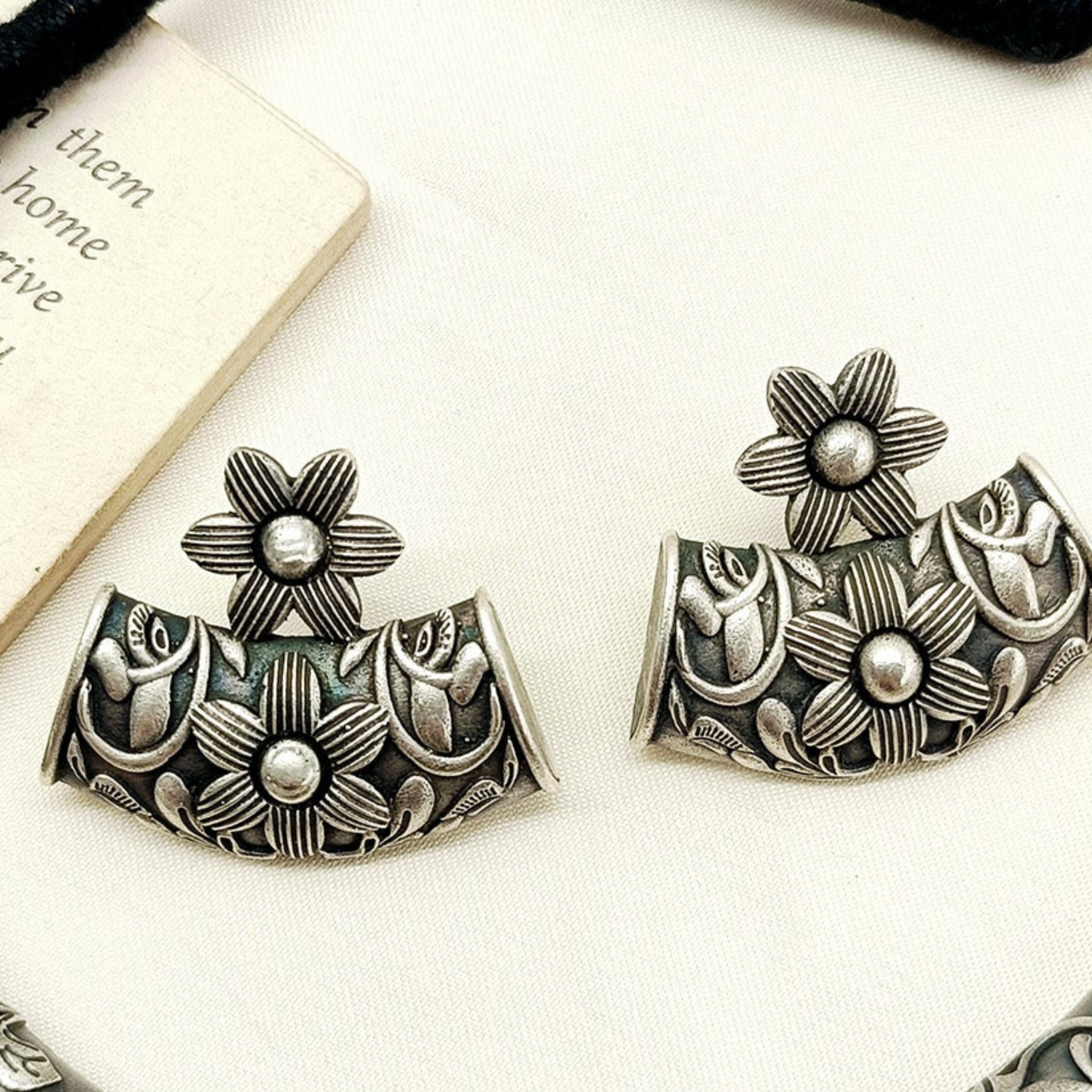 Dulcett Floral Oxidized Silver Stud Earrings - Elegant Vintage Design