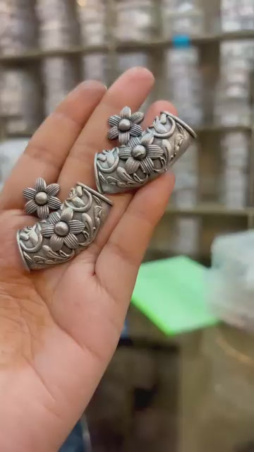 Discover the beauty of Dulcett Floral Oxidized Silver Stud Earrings. Featuring a timeless vintage design, these handcrafted earrings add a touch of elegance to any outfit. Perfect for daily wear or special occasions.