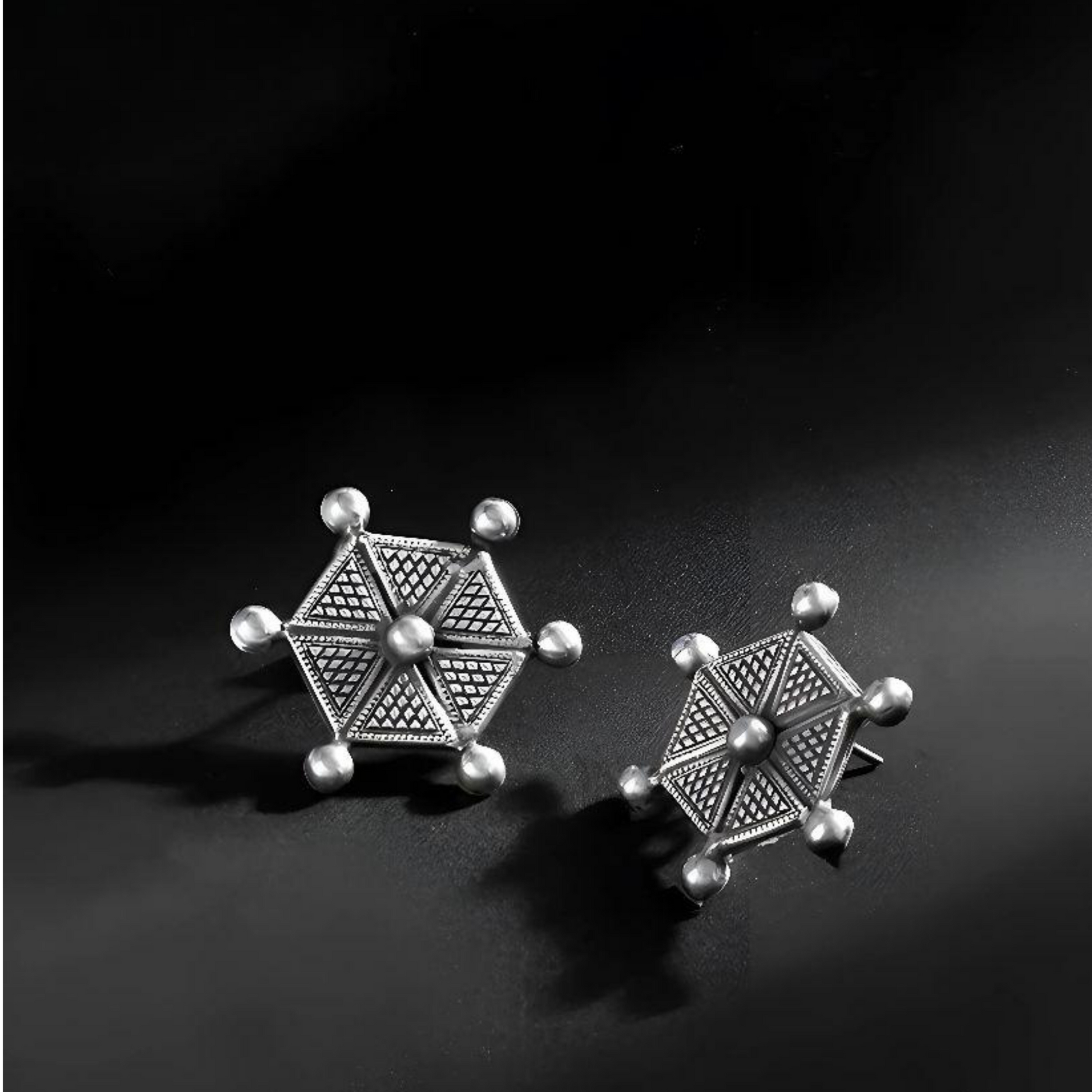 Shop Dulcett’s Hexagon Shape Oxidised Stud Earrings, crafted from high-quality silver. Featuring a unique, modern design, these elegant stud earrings are perfect for adding a bold touch of sophistication to any outfit