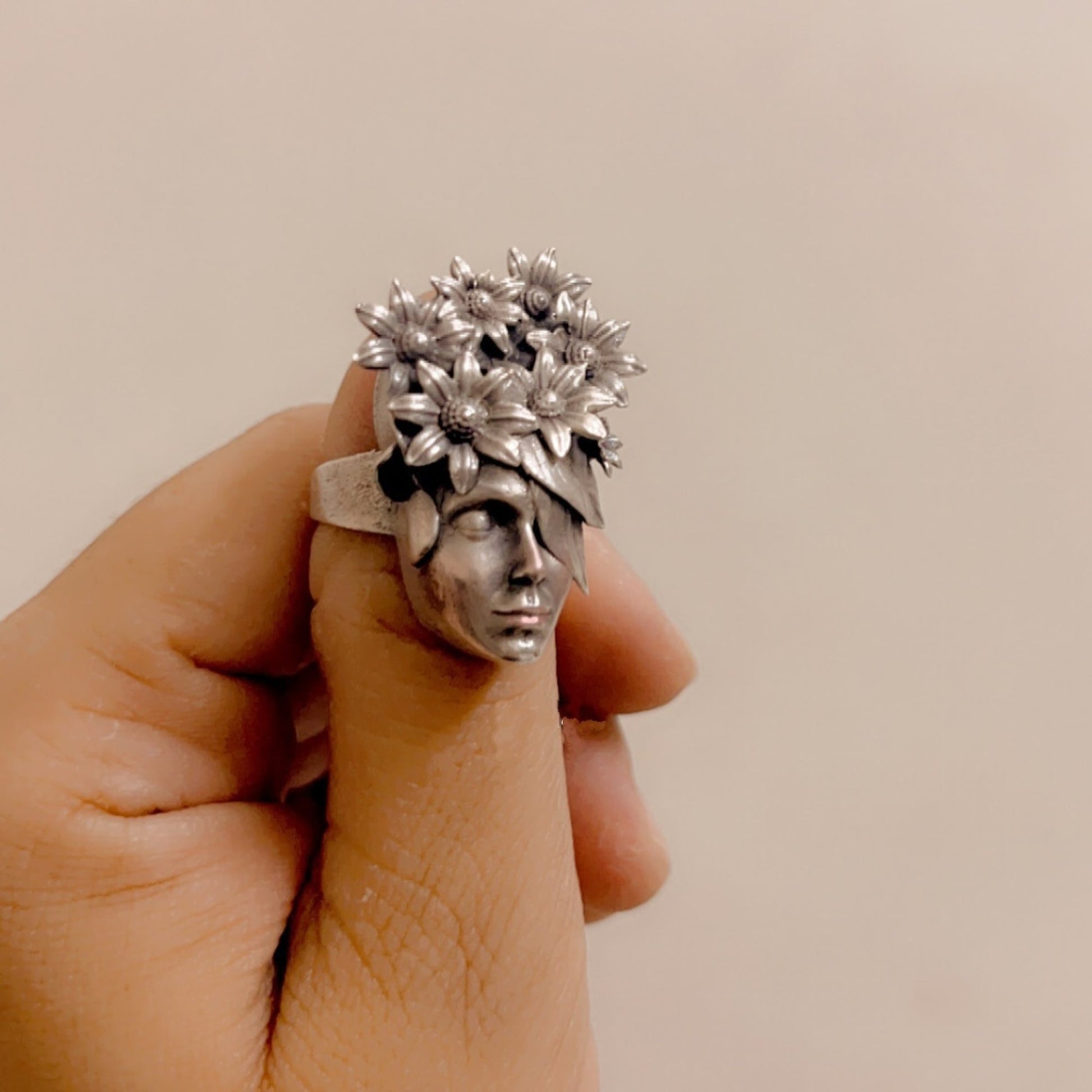 Dulcett Oxidised Silver Face Ring – Handcrafted Nature-Inspired Design