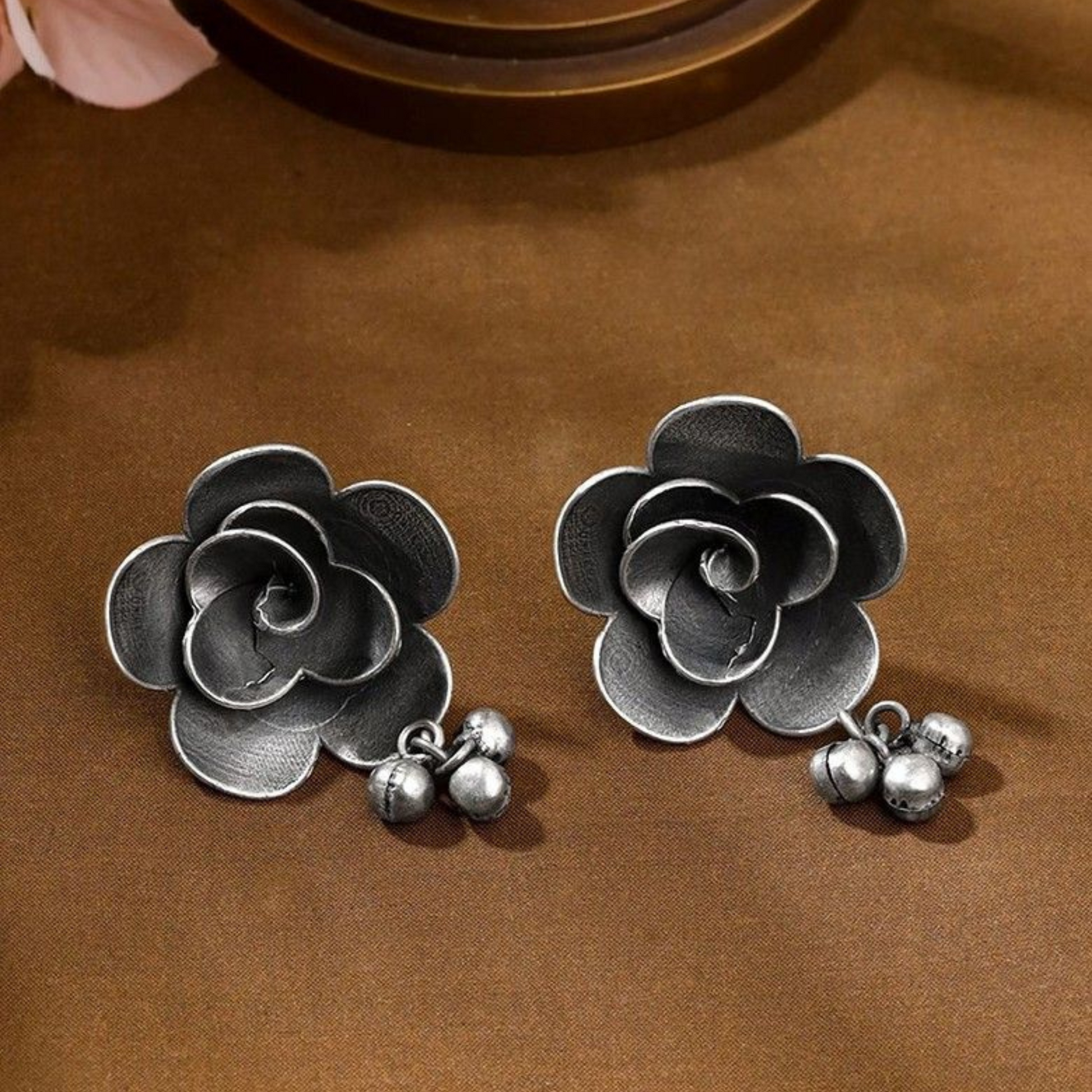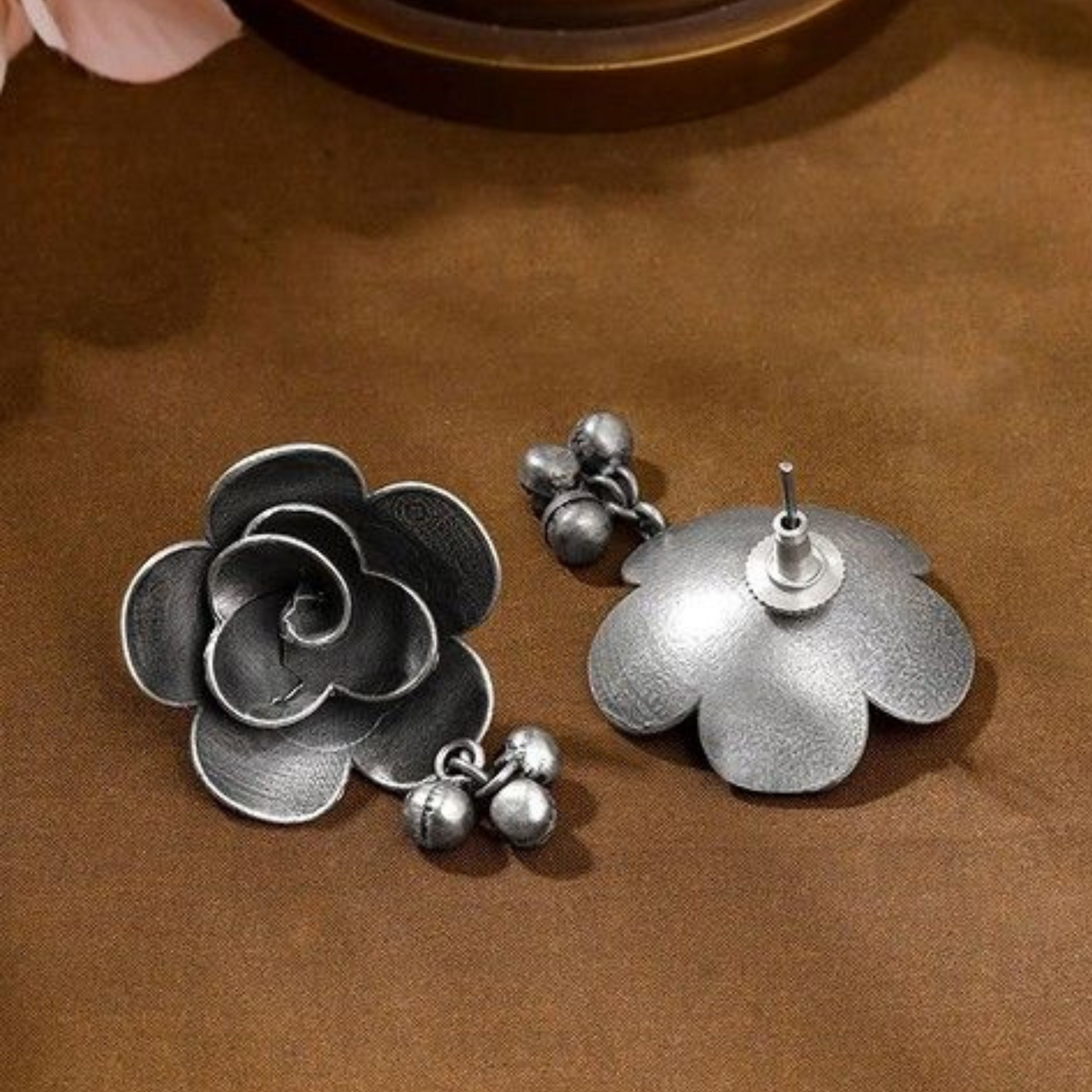 Shop Dulcett Oxidized Earrings for women featuring intricate floral shape design. Elegant and timeless oxidized stud earrings, perfect for any occasion. Discover a beautiful accessory that complements your style.