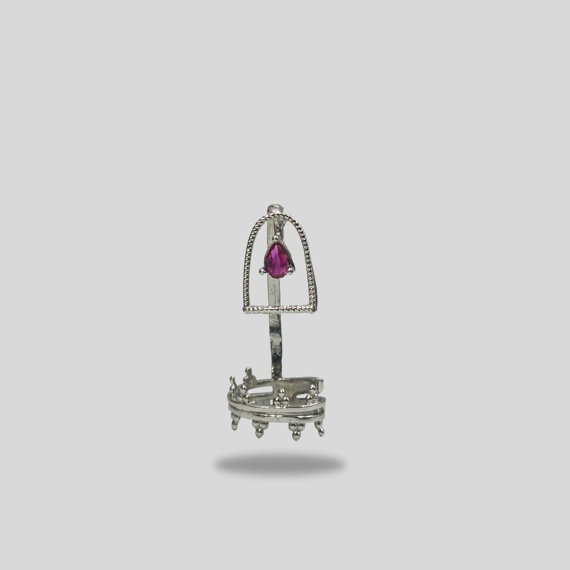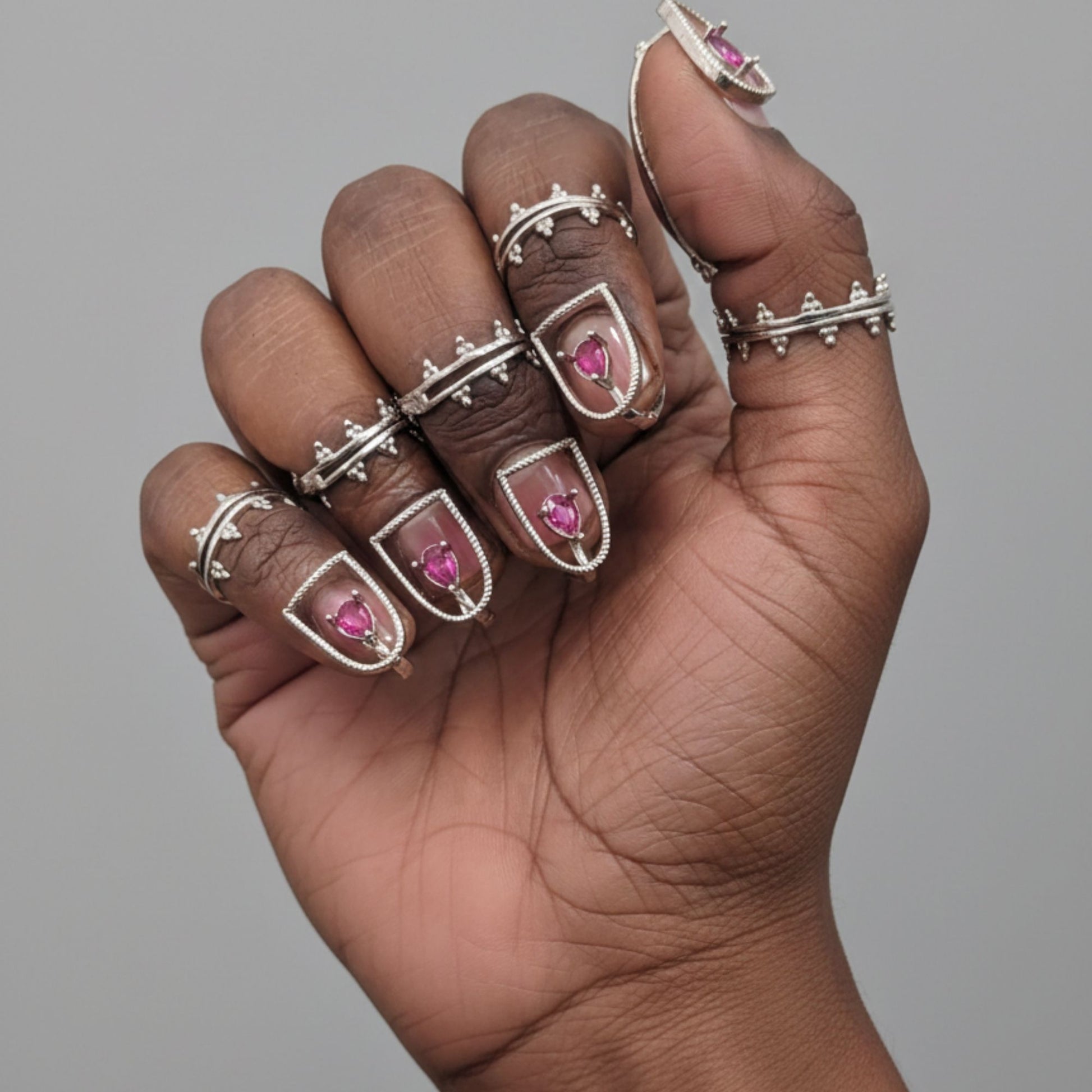 A title belonging to a woman of the highest order: royal, ethereal, and impeccably elegant. Our Regal Nail Crown embraces a captivating allure, serving as the ultimate embodiment of sophistication. Designed with a striking crimson gemstone at its heart, this piece is meticulously set to capture the light from every angle.