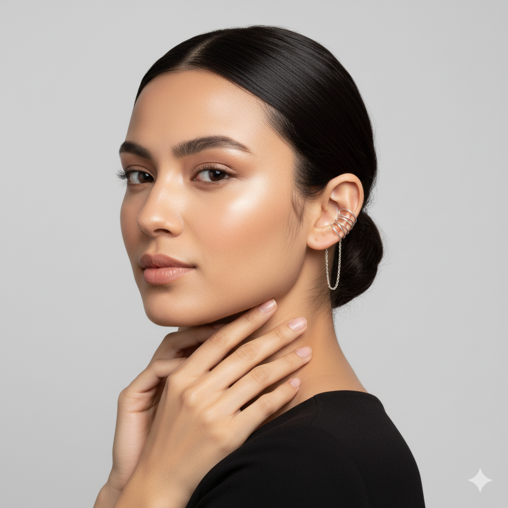 Elevate your Style instantly with our stunning silver No piercing Ear Cuff for Women. This unique spiral and chain drop design offer the bold look of an industrial piercing without any commitment. They are the perfect comfortable alternative for anyone seeking statement no piercing ear cuffs.