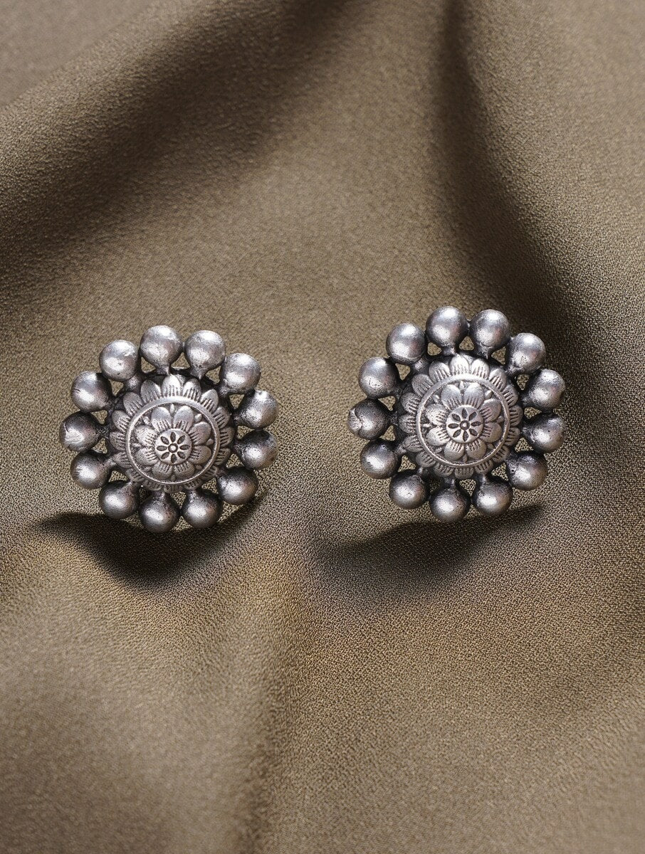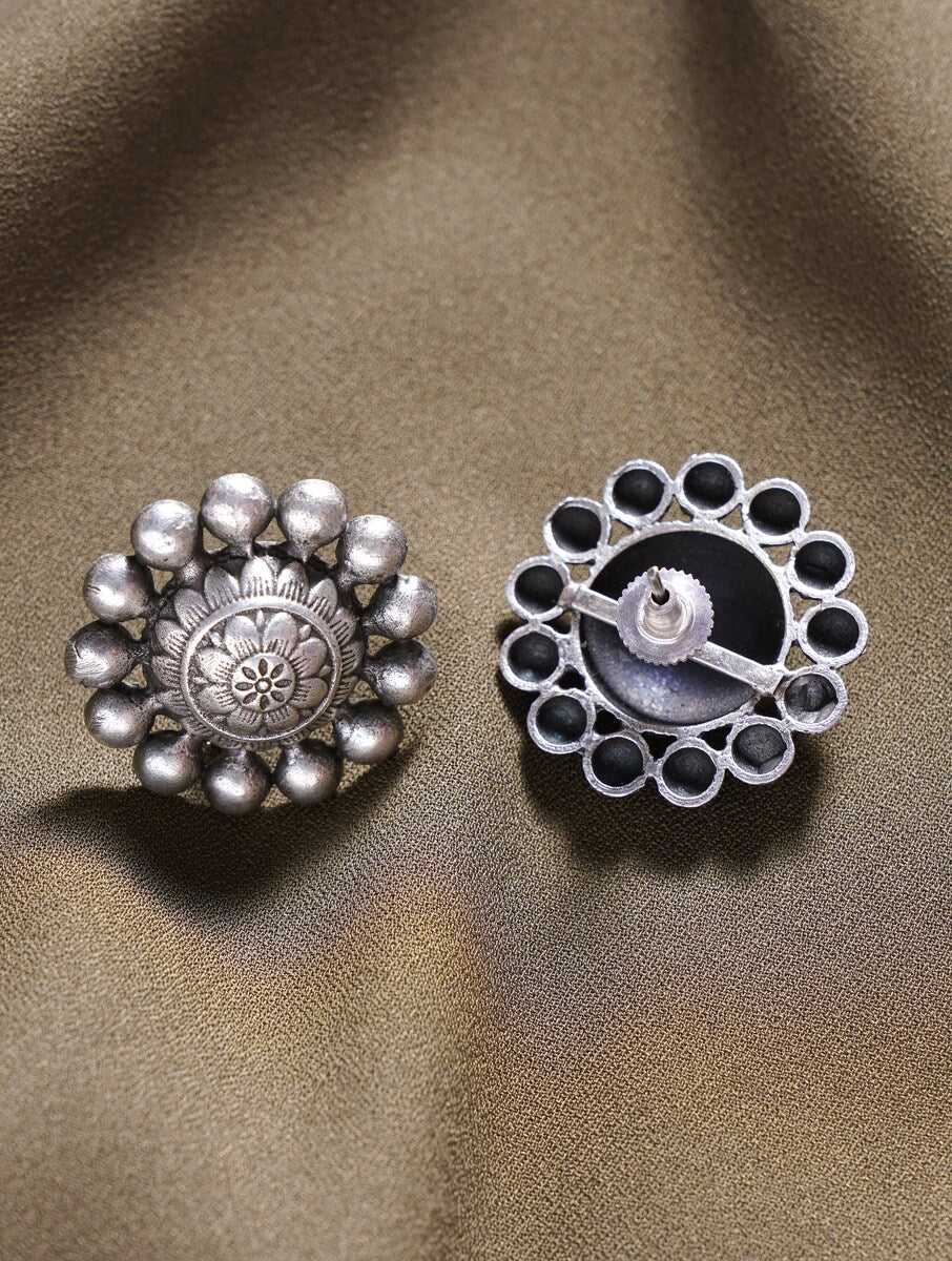 These Round Oxidized Stud Earrings are crafted from high quality silver replica brass. These earrings are durable, stylish, and will add a touch of elegance to any outfit. The oxidized finish adds a unique touch, making these earrings perfect for any occasion. Upgrade your jewelry collection with these timeless and versatile earrings.